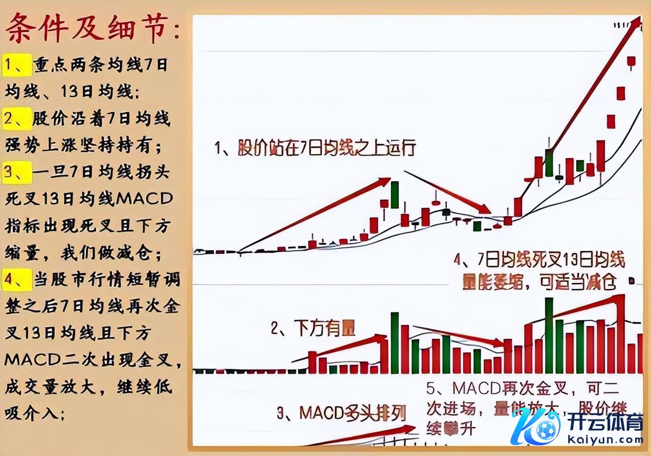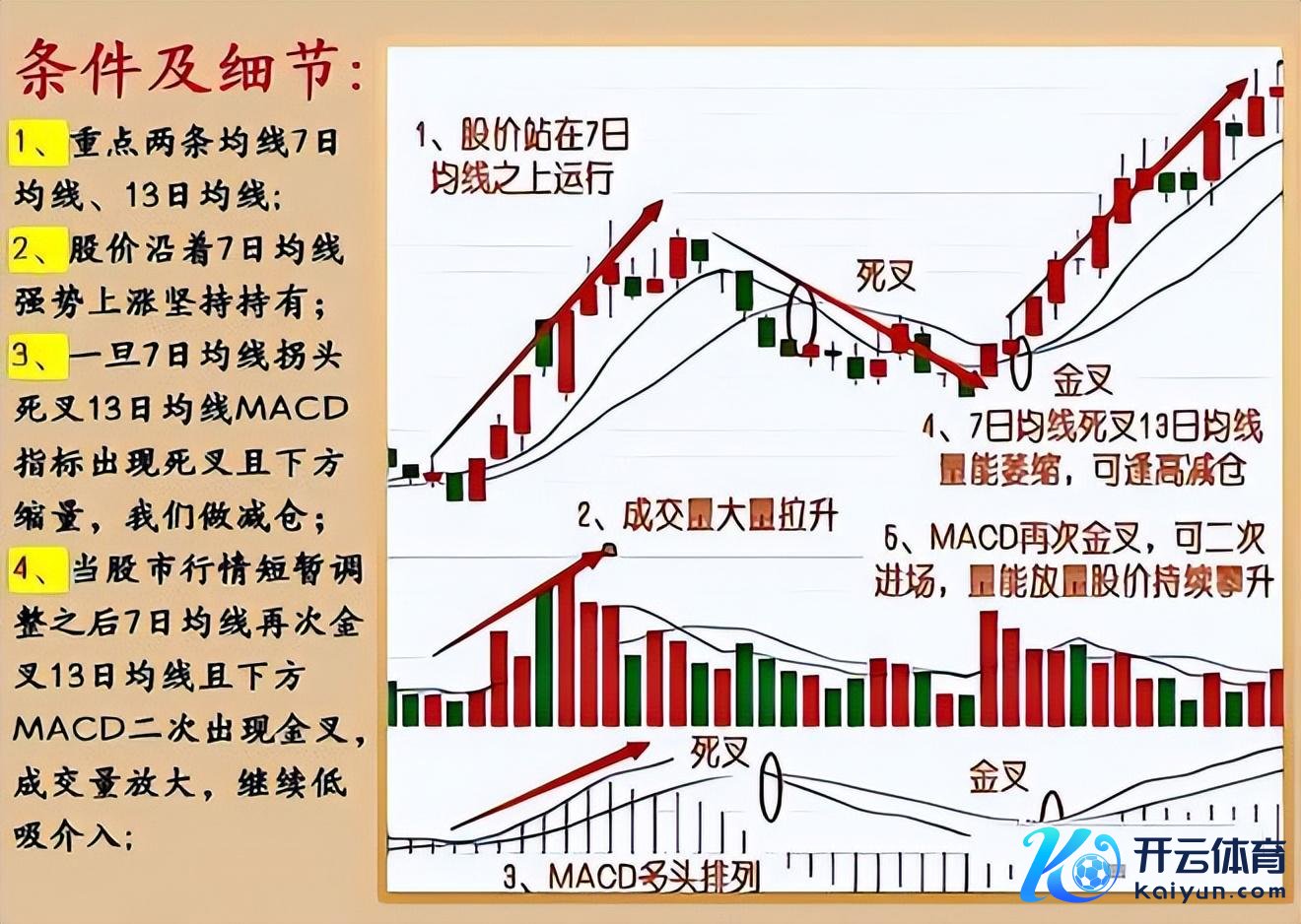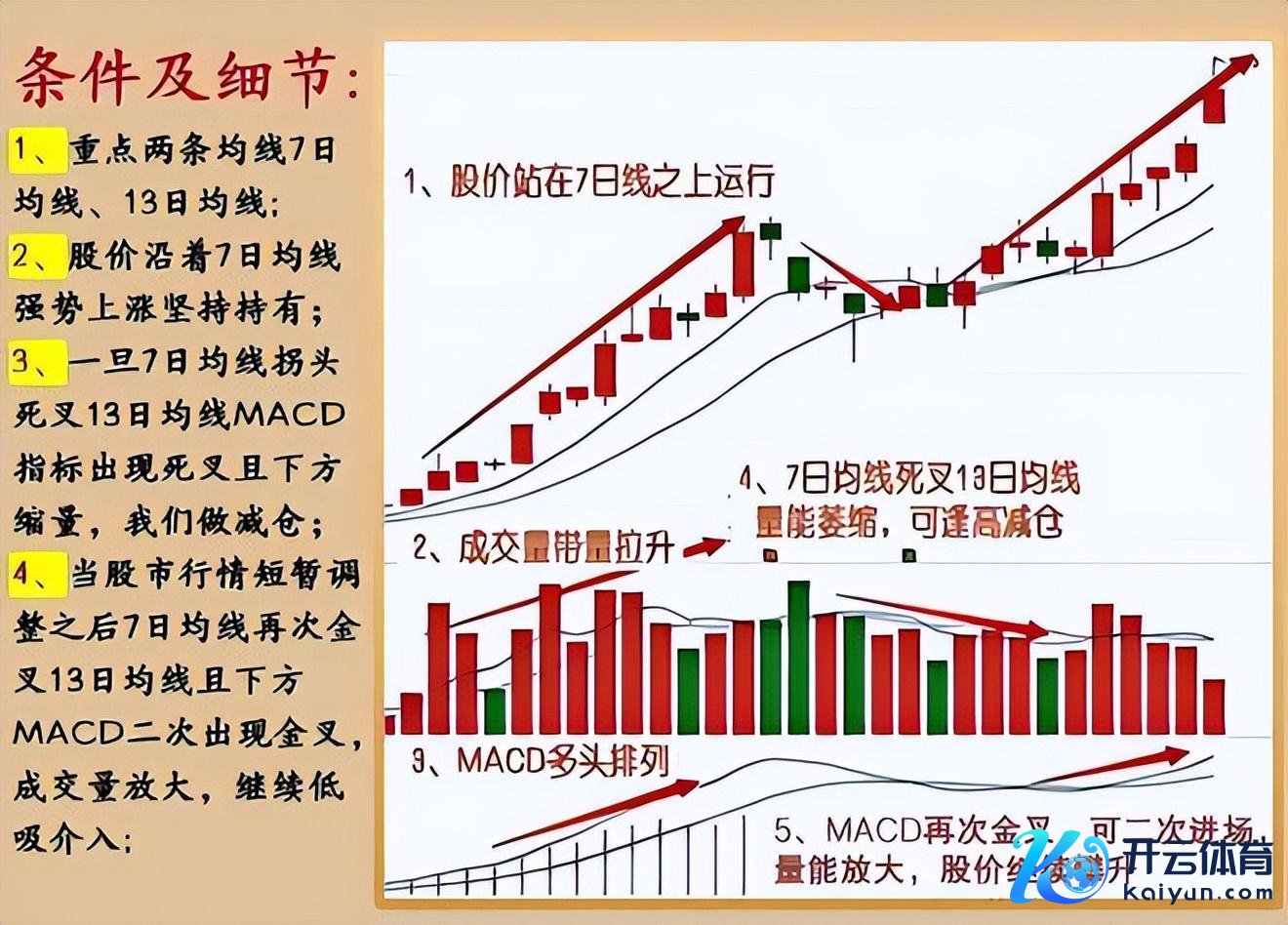 股价在回升趋势初期,小周期线金叉13天线,则是首次的介入点。此时,在回升趋势中会和善的放量,7日线在13日线上方,组成双双皆飞态势,此时即是波动持有。在回升途中,7日线缓缓拐头向下,死叉13天线,量能开首萎缩,就要逢高减仓了,这是因为短线开首走弱,首次的上扬仍是收尾,后头的行情走势则需要合作MACD来襄助。