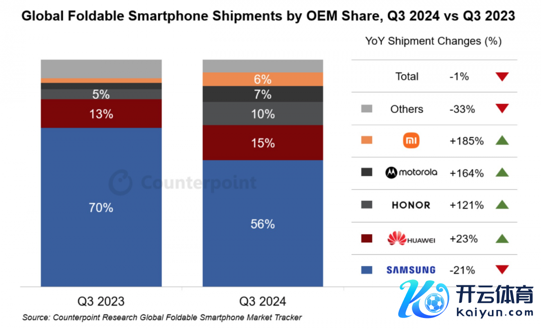字据最新全球折叠屏智高手机市集跟踪诠释,2024年第三季度全球折叠屏智高手机出货量同比下落1%。这是该市集历史上初次出现下滑,主要原因是三星全新Galaxy Z6系列推崇世俗。本年Q3三星折叠屏市集份额为56%,同比下滑14%,但仍占据第一的位置。