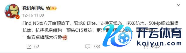 12月18日音信,博主 @数码谈天站 16日发文露馅开云官网切尔西赞助商,OPPO全新大折叠屏手机OPPO Find N5运行预热,将搭载骁龙8至尊版处置器,因循无线充,IPX8防水,50Mp舰式潜望长焦,抗摔机身结构,并可能是来岁上半年惟逐一台安卓大折叠屏旗舰手机。