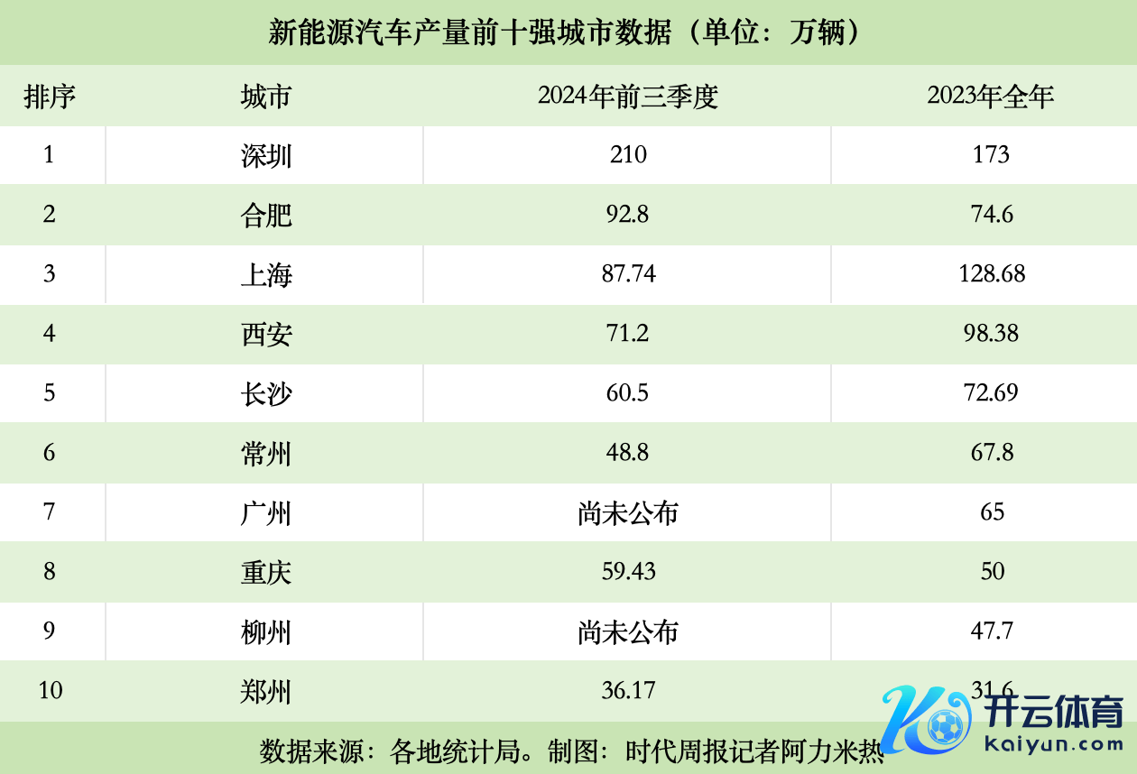 临连年末开yun体育网,新能源汽车之城的较量,日趋尖锐化。 从产量来看,在前三季度新能源汽车产量前十强城市中,深圳依旧领跑天下,产量达210万辆,展望全年产量跳跃280万辆,提前锁定了“新能源汽车第一城”。合肥、上海紧随自后,产量别离达到92.8万辆、87.74万辆,位居天下第二、第三。 不错发现,此前新能源汽车城市的第一梯队一直被深圳、上海、西安所包揽。而本年前三季度,合肥的新能源汽车脱颖而出,一举卓著西安挤进前三,以致还卓著了上海。 不外,合肥和上海之间咬得很紧,当今两城的新能源汽车产量仅