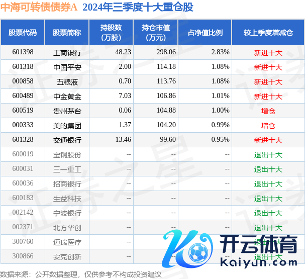 中海可转债债券A为债券型-羼杂二级基金,凭据最新一期基金季报泄露,该基金金钱树立:股票占净值比8.94%,债券占净值比95.86%,现款占净值比8.01%。基金十大重仓股如下: