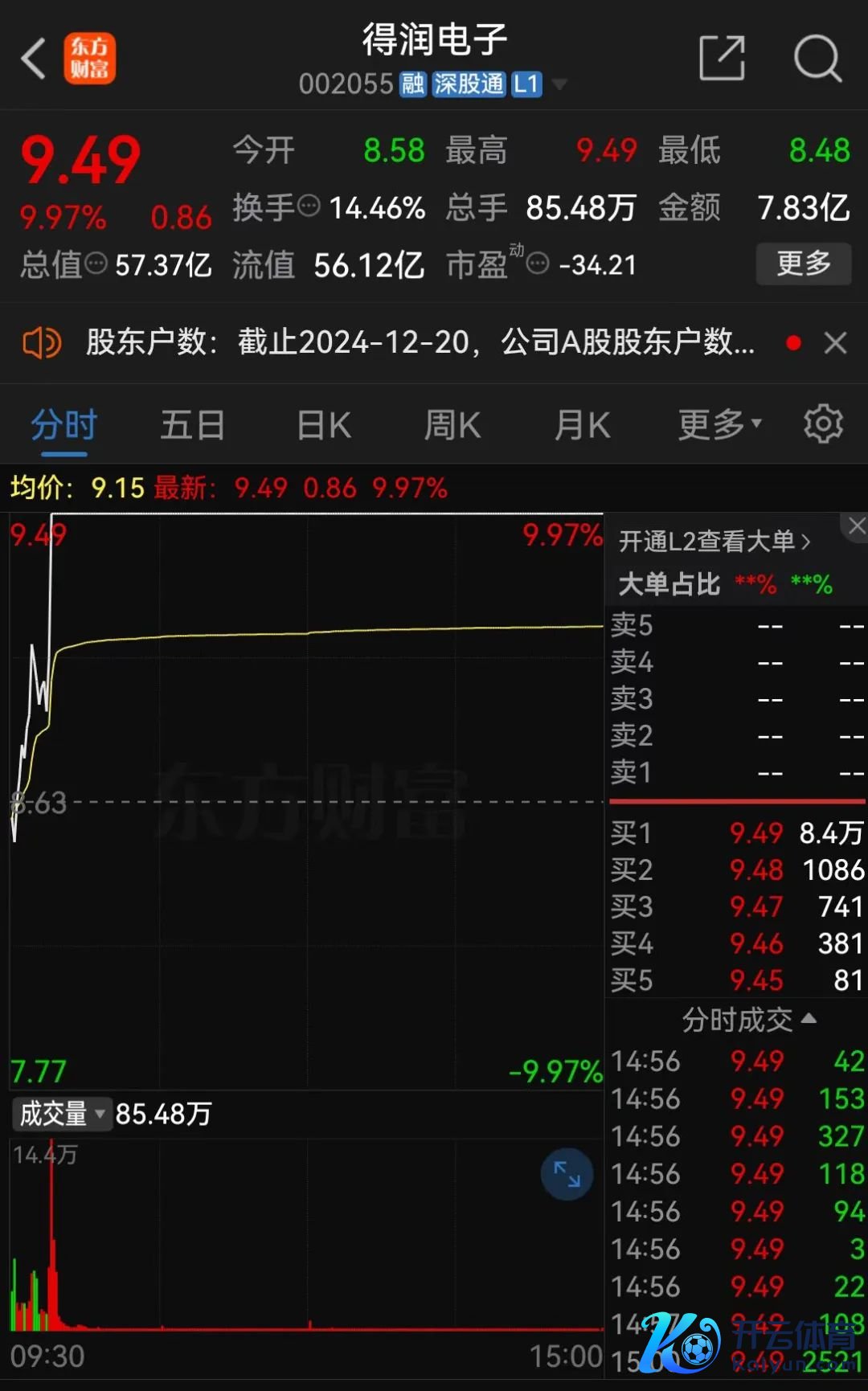 12月26日收盘,得润电子的股价报9.49元/股,涨幅达9.97%,总市值为57.37亿元。驱逐12月20日,得润电子的激动东谈主数为8.356万户。