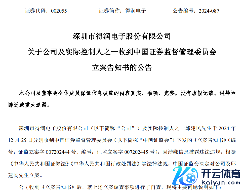 2023年12月30日,得润电子走漏《对于深圳证监局对公司接收责令改正顺次决定的公告》露出,公司存在2020年半年度至2022年半年度依期敷陈走漏的应收款项收回情况与实质不符、关频年度财报数据不准确等问题。
