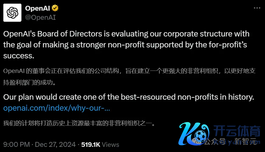 OpenAI的渔利性部门将移动为特拉华州群众利益公司(PBC),追求营业利润;而非渔利部门,接续专注于健康、训练和科学慈善劳动。从此,OpenAI再拿投资东说念主的钱云开体育,可就莫得断绝了!网友:OpenAI细致变身ClosedAI。 终于,OpenAI阐发裂变! 从此,公司一分为二,一部分是渔利机构,另一部分则曲直渔利。 经过几个月的传奇后,OpenAI的改选终于尘埃落定——OpenAI的渔利性部门将移动为特拉华州群众利益公司(PBC),使其好像同期追求利润和社会影响。 而渔利性部门的到手