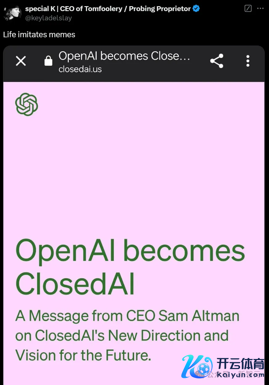 有东说念主玩弄说,‘OpenAI细致成为ClosedAI’。而来自CEO Sam Altman的一封信,标题其实是‘对于ClosedAI的新标的和将来愿景’。
